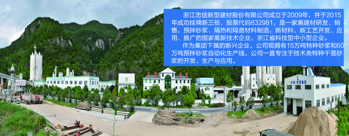 浙江忠信新型建材股份有限公司成立于2009年,并于2015年成功掛牌新三板,股票代碼832981,是一家集建材研發(fā)、銷售,預(yù)拌砂漿、隔熱和隔音材料制造,新材料、新工藝開發(fā)、應(yīng)用、推廣的國(guó)家高新技術(shù)企業(yè),浙江省科技型中小型企業(yè)。