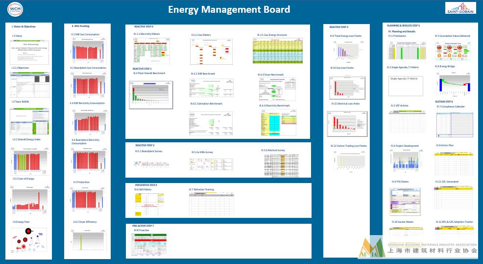 能源成本在圣戈班的產(chǎn)品成本占比較高中,因此圣戈班集團(tuán)和企業(yè)對于能源管理建立了自己獨特的管理體系。在WCM(世界級制造)的管理體系中,專設(shè)能源管理內(nèi)容,由專職人員進(jìn)行工廠能源統(tǒng)計監(jiān)測與分析,與圣戈班集團(tuán)內(nèi)部其他工廠進(jìn)行最佳實踐對標(biāo),找出差距并分析相關(guān)損失內(nèi)容和原因,制定年度管理計劃。通過技術(shù)改進(jìn)和管理改進(jìn)等手段,來達(dá)到相關(guān)的年度能耗目標(biāo)。