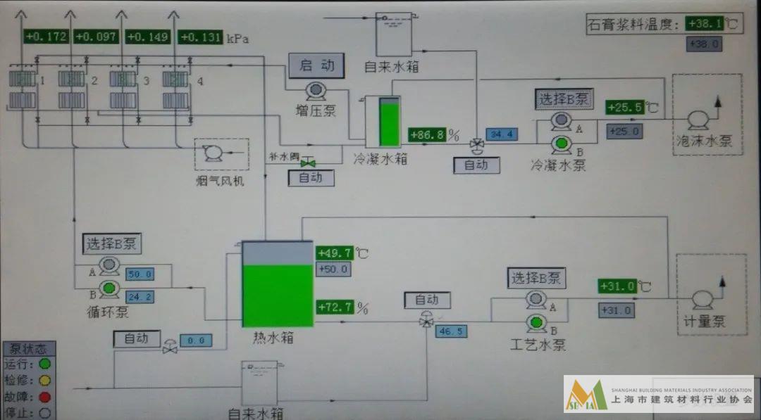 工廠烘箱用天然氣加熱空氣后在烘箱內(nèi)部與石膏板接觸,使得潮濕的石膏板把內(nèi)部的水分蒸發(fā)出去,大量的水汽通過煙囪外排至廠外。石膏粉摻水后進(jìn)入鋪料機(jī),貼面紙后切割成濕石膏板,送入烘箱進(jìn)行干燥,將原摻入的水份排出,得成品的石膏板。當(dāng)環(huán)境溫度低時,水溫也低,此時的濕石膏板溫度也低,送入烘房將消耗更多的燃料。通過對熱循環(huán)水系統(tǒng)改造,在烘箱排煙氣管道上加裝煙氣-水換熱裝置,冬季回收煙氣余熱加熱工藝水,提高進(jìn)入烘箱的板溫,把工藝用的自來水通過與水汽進(jìn)行熱交換,自來水水溫從室溫增加至33-35℃溫水,利用石膏粉的水合效應(yīng),在理想的水溫下激活水合,加快水合反應(yīng)。使得石膏板在沒有進(jìn)入烘箱前就完成了部分水分自我蒸發(fā),降低了烘箱的蒸發(fā)負(fù)擔(dān),節(jié)省了大量的天然氣消耗,從達(dá)到節(jié)能降耗的目的,同時將原來排至大氣中的水蒸汽經(jīng)過熱交換后凝結(jié)成水,重新進(jìn)行回用,節(jié)能的同時還節(jié)省了耗水量。年節(jié)約能耗近500噸標(biāo)準(zhǔn)煤。
