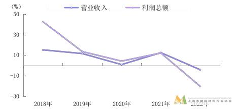 圖 1 2018—2022 年規(guī)模以上建材行業(yè)營業(yè)收入及利潤增速